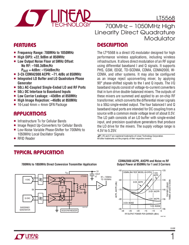 LT5568 700MHz to 1050MHz High Linearity Direct Quadrature Modulator