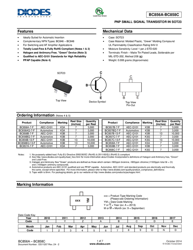 Tranzystor; BC856B-7-F; PNP; 100mA; 350mW; 65V; 200MHz; bipolarny; SOT23; SMD; marking: K3A; DIODES; RoHS; opakowanie/100szt