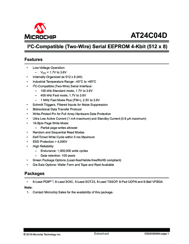 AT24C04D I2C-Compatible Two-Wire Serial EEPROM 4-Kbit Data Sheet