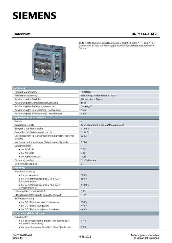 3NP11441DA20 Siemens 3NP11441DA20 Rozłącznik bezpiecznikowy Rozmiar bezpiecznika = 1 250...