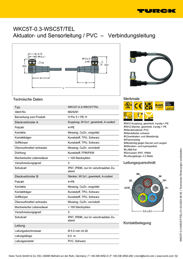 Turck 6625261 Złącze konfekcjonowane czujnika/aktuatora WKC5T-0,3-WSC5T/TEL, piny: 5, 0.30 m, 1 szt.