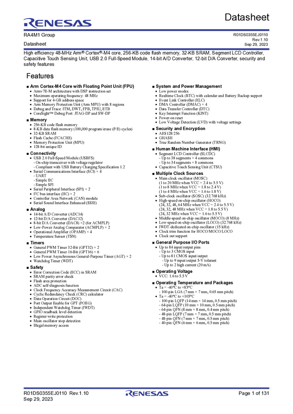 RA4M1 32-bit Microcontrollers with 48MHz Arm Cortex-M4 and LCD Controller and Cap...
