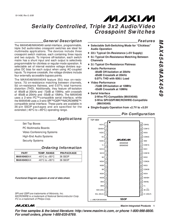 MAX4548 Serially Controlled, Triple 3x2 Audio/Video Crosspoint Switches