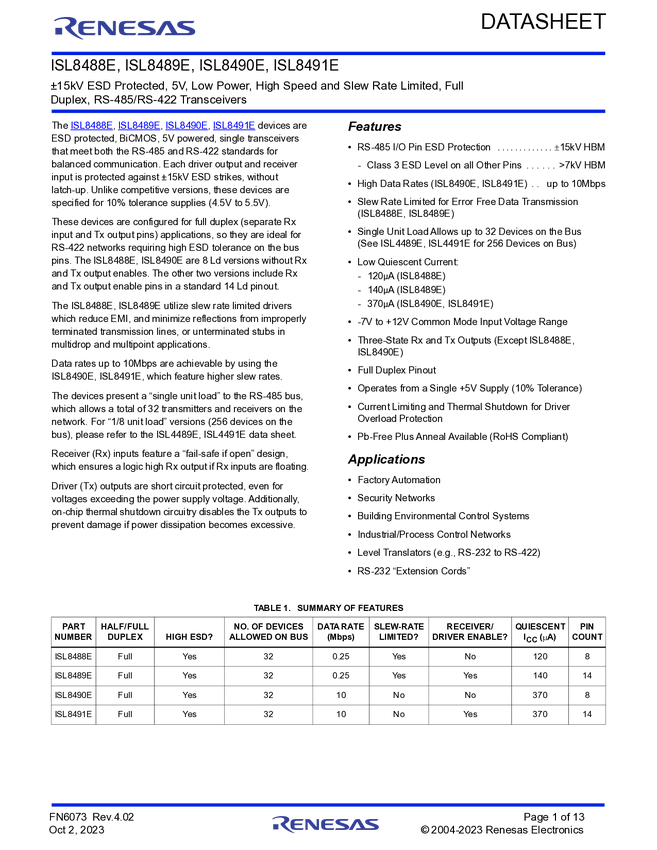 ±15kV ESD Protected, 5V, Low Power, High Speed and Slew Rate Limited, Full Duplex, RS-485/RS-422 Transceivers