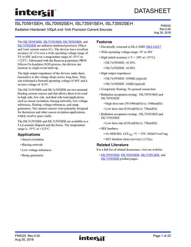 ISL73592SEH Radiation Hardened 100µA and 1mA Precision Current Source