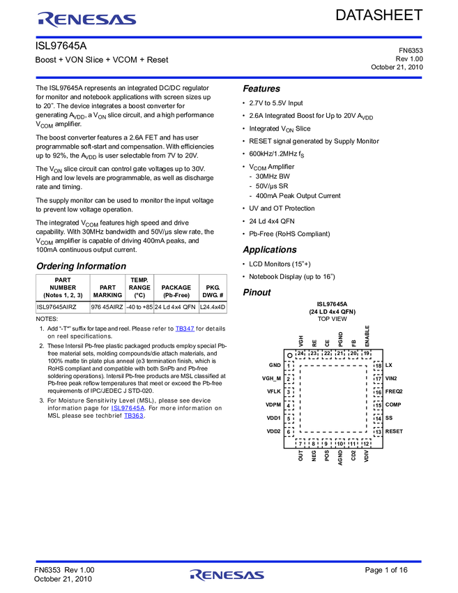 ISL97645A Boost + VON Slice + VCOM + Reset