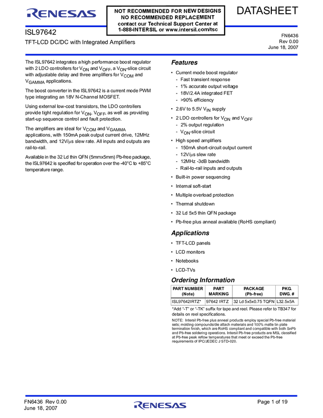 ISL97642 TFT-LCD DC/DC with Integrated Amplifiers