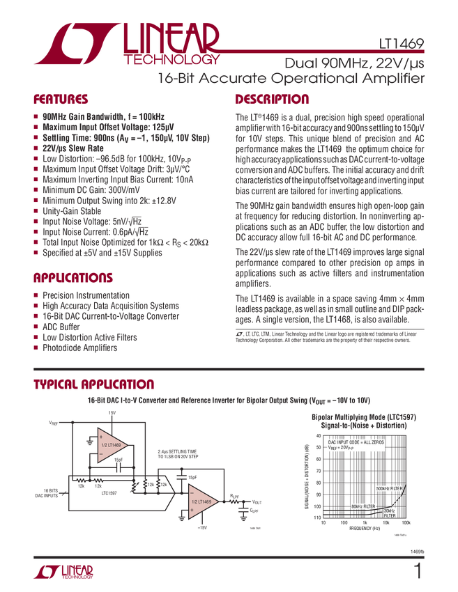 LT1469 Dual 90MHz, 22V/µs 16-Bit Accurate Operational Amplifier