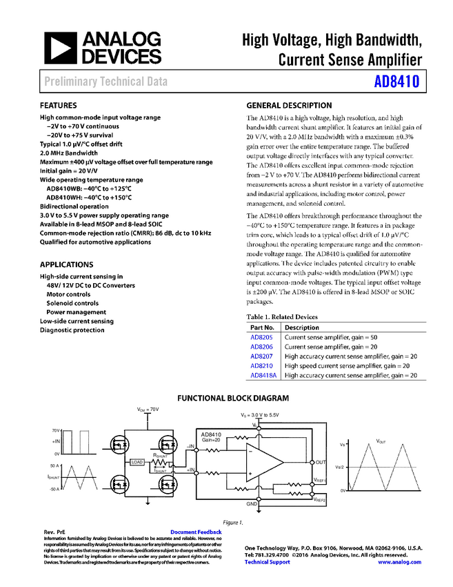 AD8410 High Voltage, High Bandwidth, Current Sense Amplifier