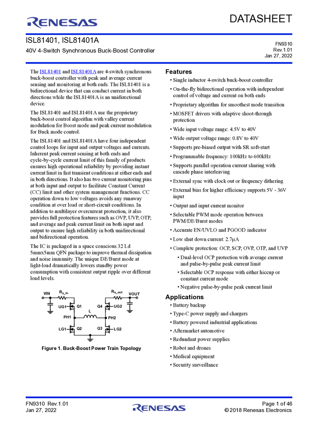 ISL81401 40V Bidirectional 4- Switch Synchronous Buck-Boost Controller