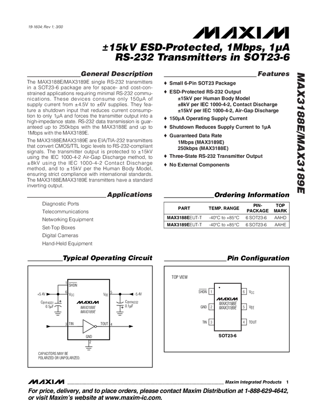 MAX3188E ±15kV ESD-Protected, 1Mbps, 1µA RS-232 Transmitters in SOT23-6