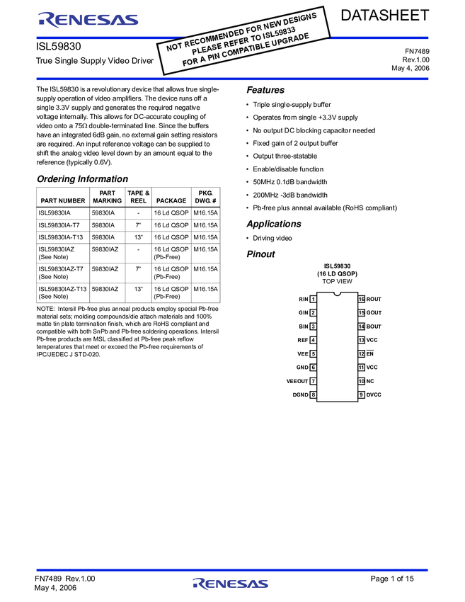 ISL59830IAZ, ISL59830IAZ-T13, ISL59830IAZ-T7