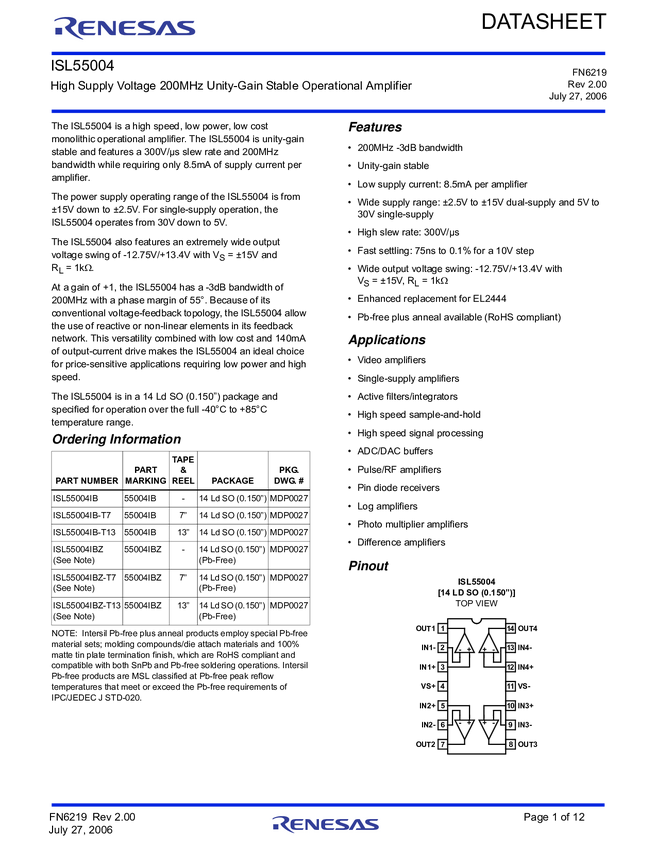 ISL55004 High Supply Voltage 200MHz Unity-Gain Stable Operational Amplifier