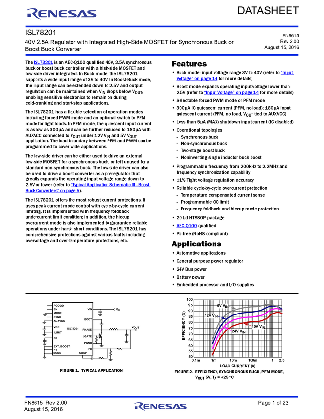 ISL78201 40V 2.5A Regulator with Integrated High-Side MOSFET for Synchronous Buck or...