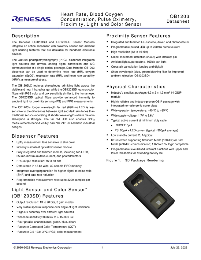 OB1203 Heart Rate, Blood Oxygen Concentration, Pulse Oximetry, Proximity, Light an...