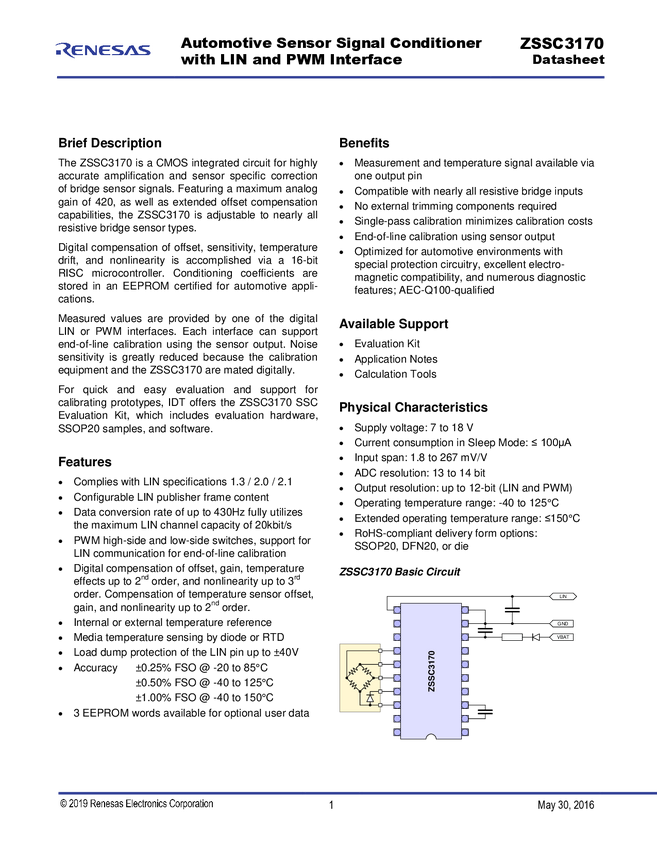 ZSSC3170 Automotive Sensor Signal Conditioner with LIN and PWM Interface