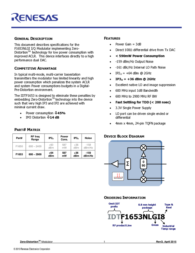 F1653 Broadband ZIF/CIF I/Q Modulator for High Order LTE MIMO Systems