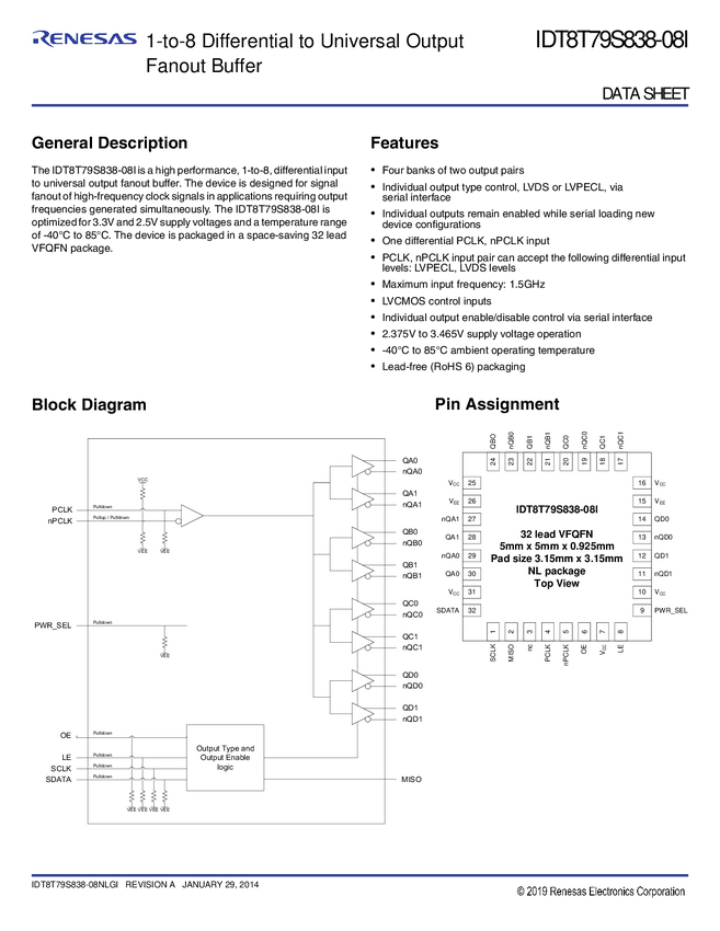 8T79S838-08I 1-to-8 Differential to Universal Output Fanout Buffer