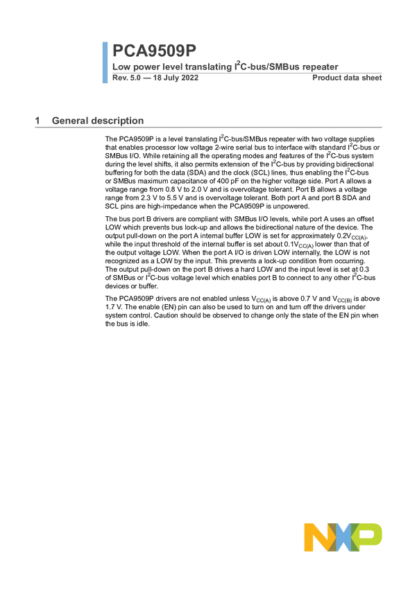 PCA9509PDP Dual Supply Low power level translating I2C-bus/SMBus repeater