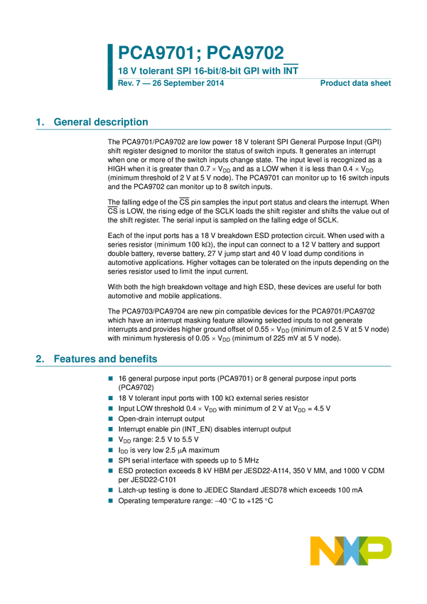 PCA9702PW 18 V tolerant SPI 16-bit/8-bit GPI with INT