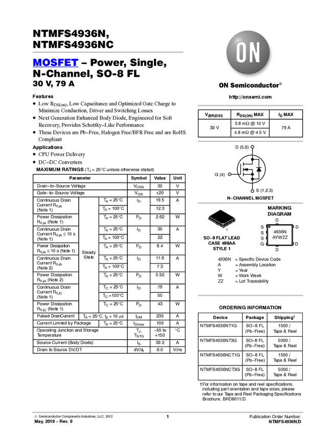 NTMFS4936N Single N-Channel Power MOSFET 30V, 79A, 3.8mΩ