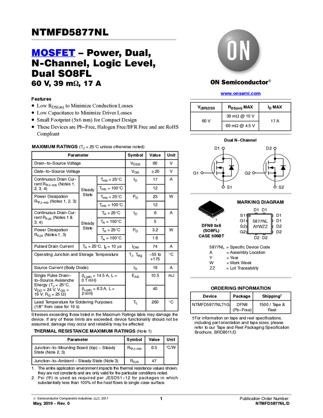 NTMFD5877NL Power MOSFET, Dual N-Channel, Logic Level, 60 V, 17 A, 39 mΩ