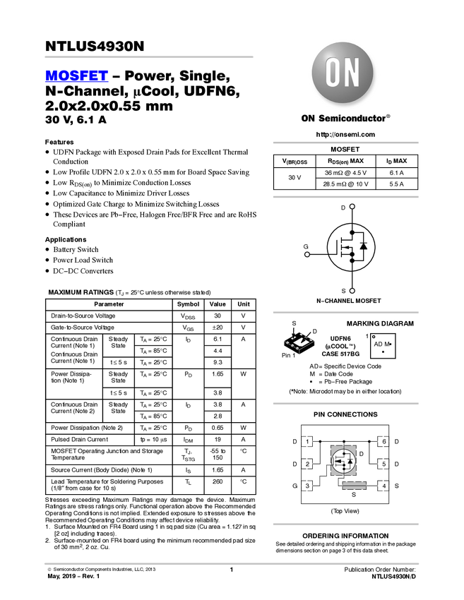 NTLUS4930N Single N-Channel µCool™ Power MOSFET 30V 6.1A 28.5mΩ