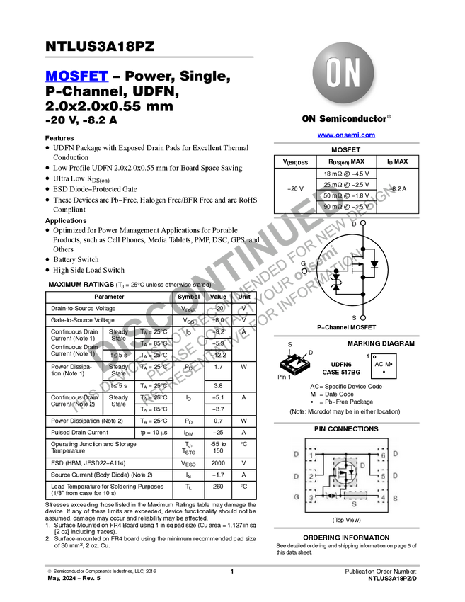 NTLUS3A18PZ Single P-Channel Power MOSFET with ESD Protection -20V -8.2A 18mΩ
