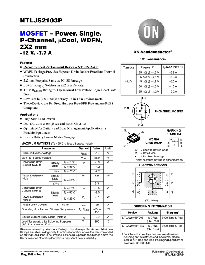 NTLJS2103P Single P-Channel µCool™ Power MOSFET -12V -7.7A 40mΩ