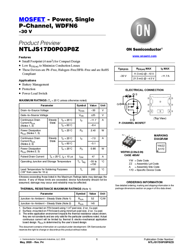 NTLJS17D0P03P8Z MOSFET, -30V Single P-Channel, Power Clip22
