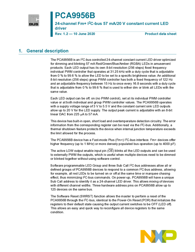 PCA9956BTW 24-bit 57 mA Constant current LED Driver with 1 MHz I2C interface in HTSSOP...