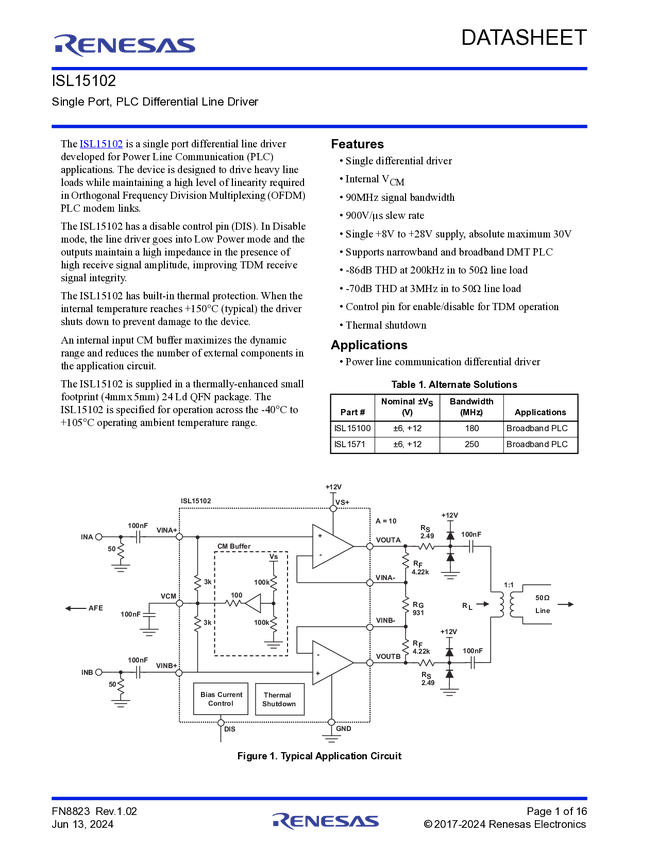ISL15102IRZ Single Port, PLC Differential Line Driver