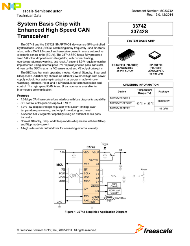 MC33742PEG System Basis Chip, CAN, 2x 5.0V/200mA LDOs, 4 wake ups, 15 ms reset duratio...