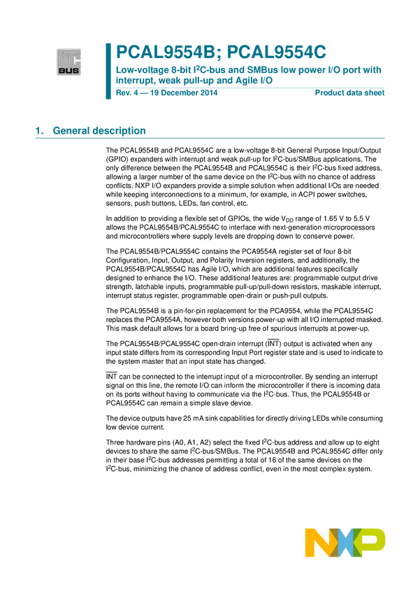 Low-voltage 8-bit I2C-bus and SMBus low power I/O port with interrupt, weak pull-up and Agile I/O