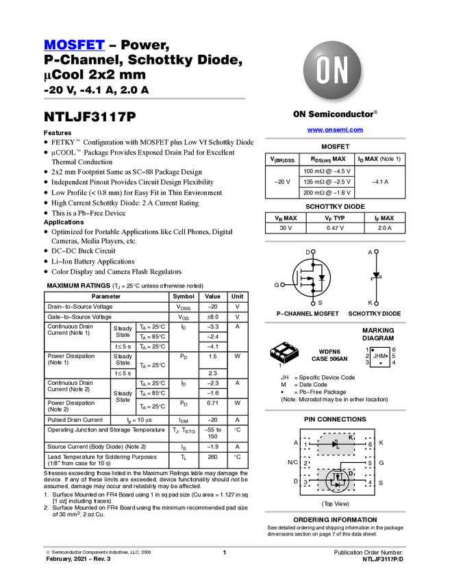 NTLJF3117P Single P-Channel µCool™ Power MOSFET with Schottky Diode -20V -4.1A 100mΩ