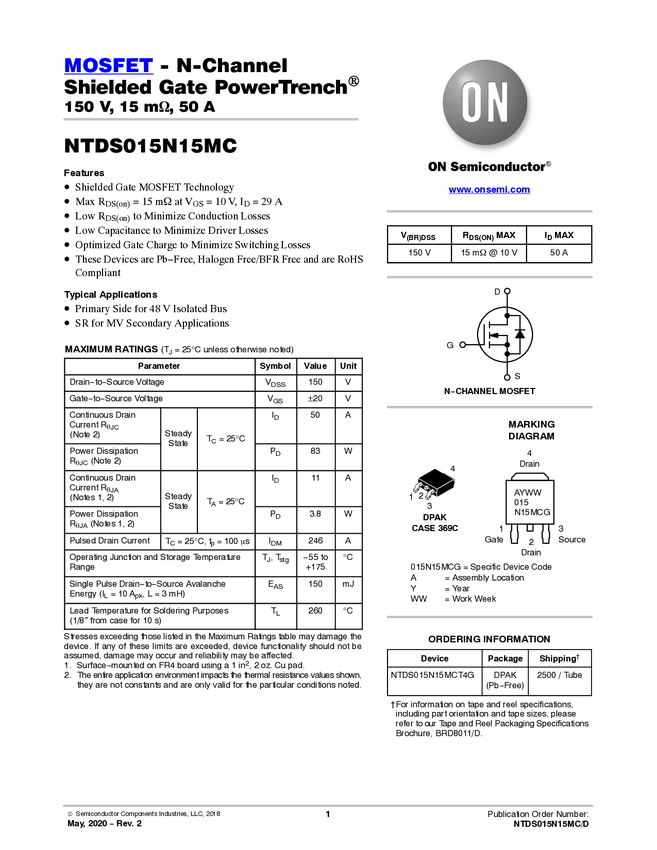 NTDS015N15MCT4G N-Channel Shielded Gate PowerTrench<sup>® MOSFET 150 V, 50 A, 15 mΩ