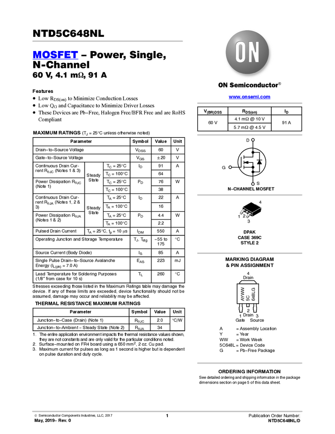 NTD5C648NL Single N-Channel Power MOSFET 60V, 91A, 4.1mΩ