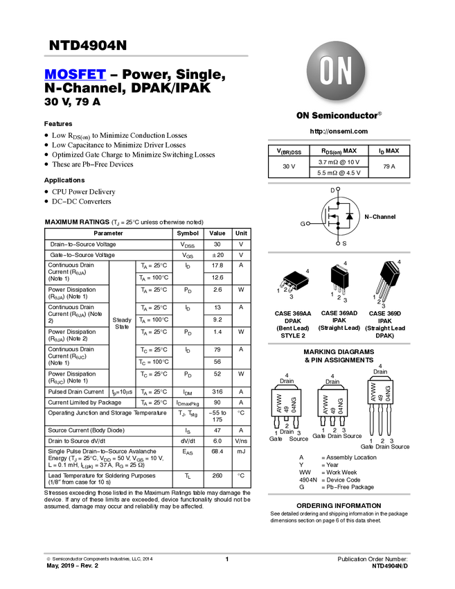 NTD4904N Single N-Channel Power MOSFET 30V, 79A, 3.7mΩ