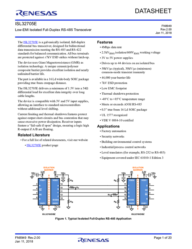 ISL32705EIBZ Low-EMI Isolated Full-Duplex RS-485 Transceiver
