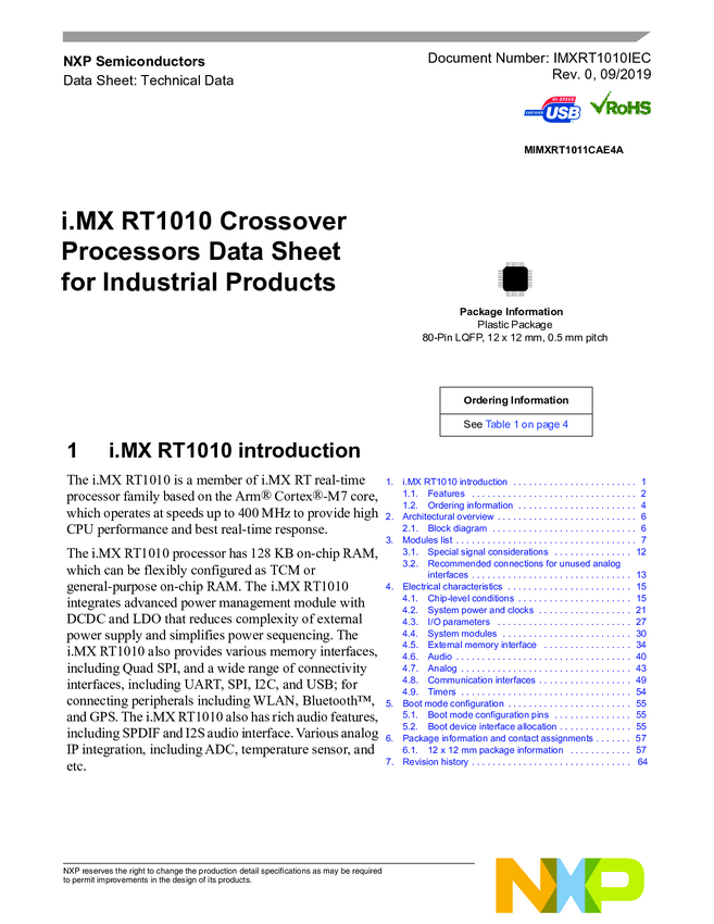 i.MX RT1010 Crossover MCU with Arm<sup>&#174;</sup> Cortex<sup>&#174;</sup>-M7 Core Operating Up to 500 MHz