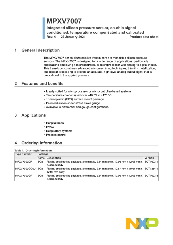MPXV7007GC6U Pressure Sensor, 5V, -7/7kPa, SOP 8, Axial Port
