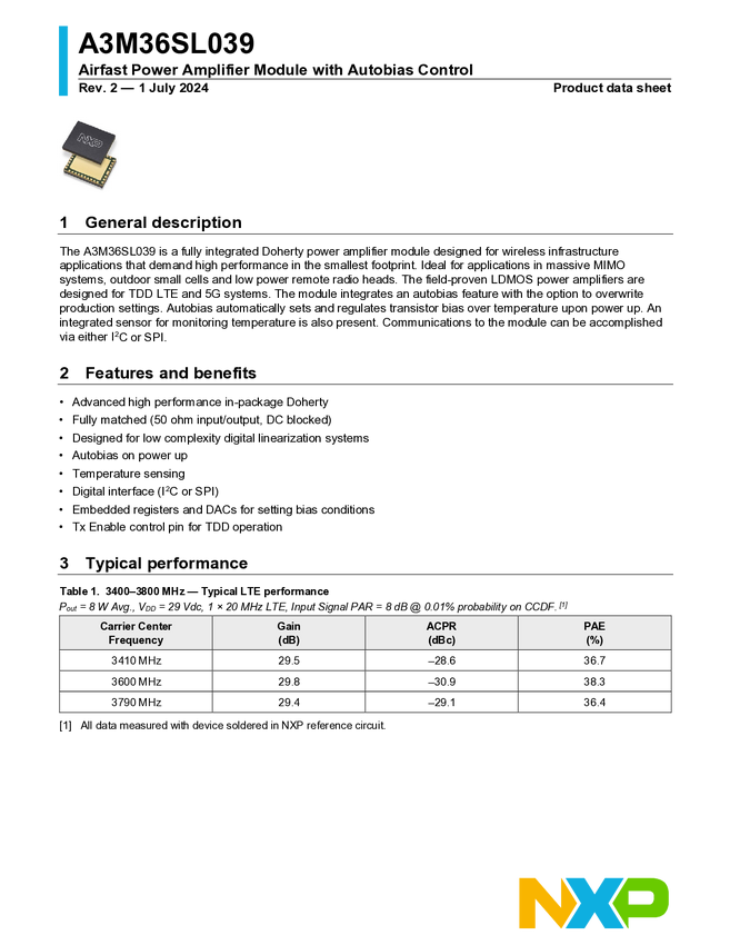 A3M36SL039 Airfast Power Amplifier Module with Autobias Control, 3400-3800 MHz, 29 dB,...