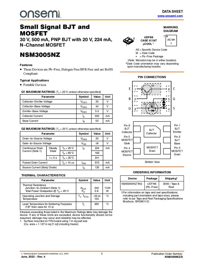 NSM3005NZ N−Channel MOSFET 20 V, 224 mA with Small Signal PNP BJT, 30 V, 500 mA