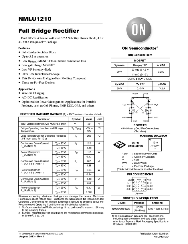 NMLU1210 Dual 20V N-Channel Full Bridge Rectifier 3.2A 26 mΩ