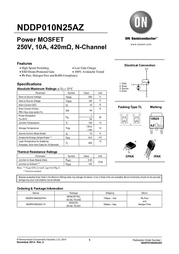NDDP010N25AZ Single N-Channel Power MOSFET 250V, 10A, 420mΩ