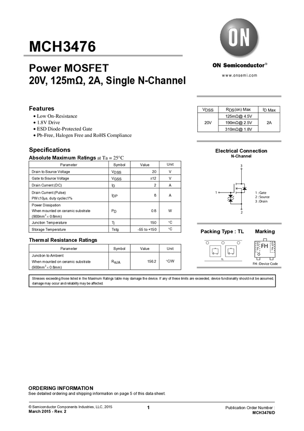 MCH3476 Single N-Channel Power MOSFET 20V, 2A, 125mΩ