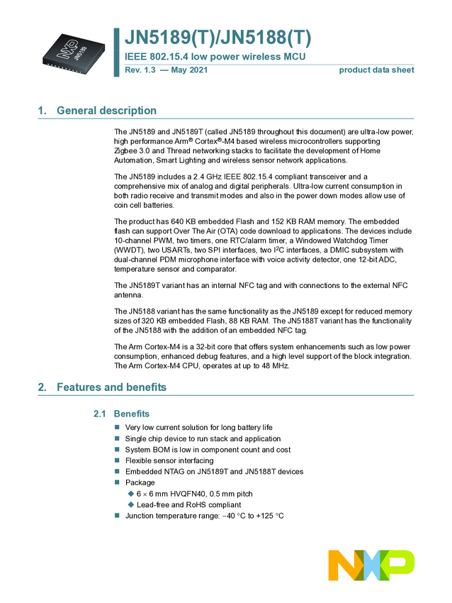 JN5189/88 (T): High-Performance and Ultra-Low-Power MCUs for Zigbee<sup>&#174;</sup> and Thread with Built-In NFC Option
