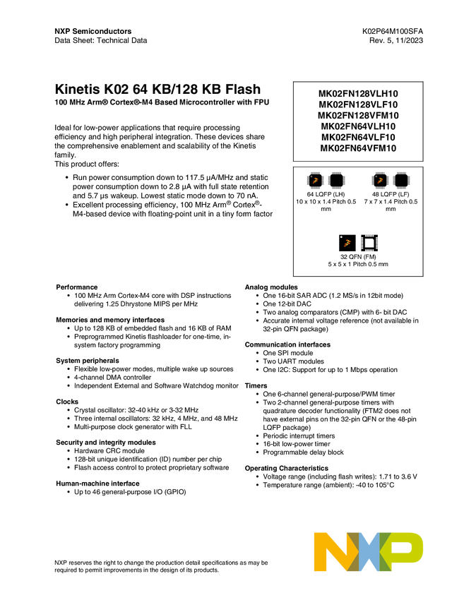 - MK02FN128VLH10, MK02FN128VFM10, MK02FN64VFM10, MK02FN64VLF10