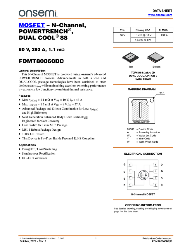 FDMT80060DC N-Channel Dual Cool<sup>TM 88 PowerTrench<sup>® MOSFET 60V, 292A, 1.1mΩ