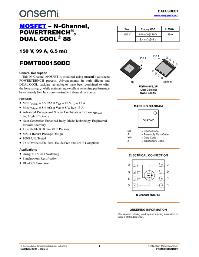 N-Channel Dual Cool<sup>TM 88 PowerTrench<sup>® MOSFET 150V, 99A, 6.5mΩ